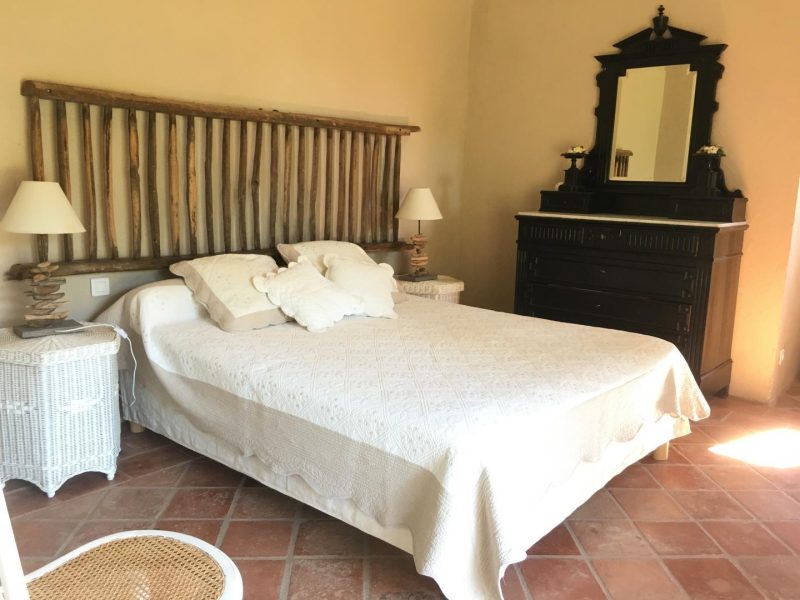 - Accès à l'étage (climatisé) avec un escalier en colimaçon en fer forgé : chambre avec un lit en 160 face à une grande fenêtre permettant d'apprécier la vue sur le jardin depuis le lit ! Depuis la chambre, accès à la salle d'eau avec douche, vasque et wc.