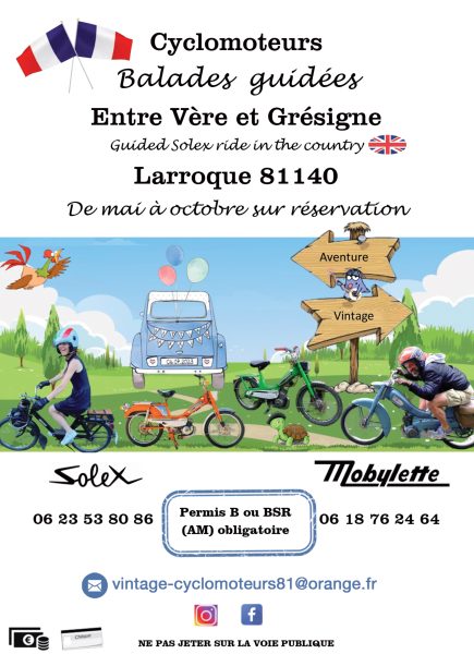 Vintage Cyclomoteurs 81 propose des balades commentées au guidon de mobylettes vintages qui ont véhiculé des générations. D'avril à fin novembre, vivez des moments extraordinaires au cœur de la forteresse de Puycelsi, découvrez les secrets de la cité médiévale de Castelnau-de-Montmiral, nos coins insolites, traversez l'écrin de nature de la Grésigne (dernier four à verre, pierre royale, mur de Colbert, dolmen), et bien d'autres parcours (œnotourisme dans les vignobles gaillacois).