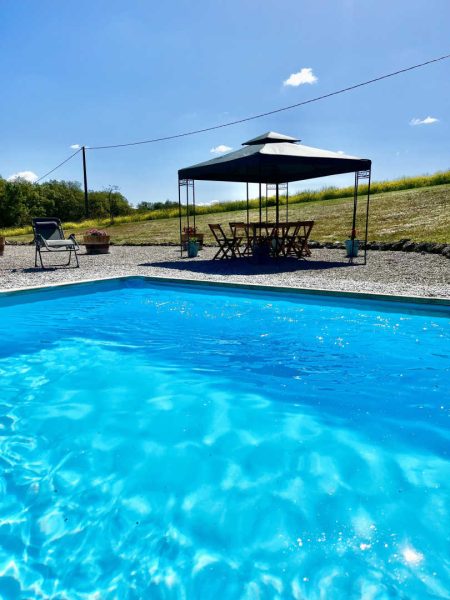 La piscine privative avec système de sécurité par alarme est ouverte toute l'année (non chauffée). Dimensions 4x8m, fond plat sur 1,35 m de profondeur.