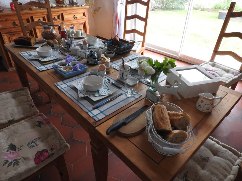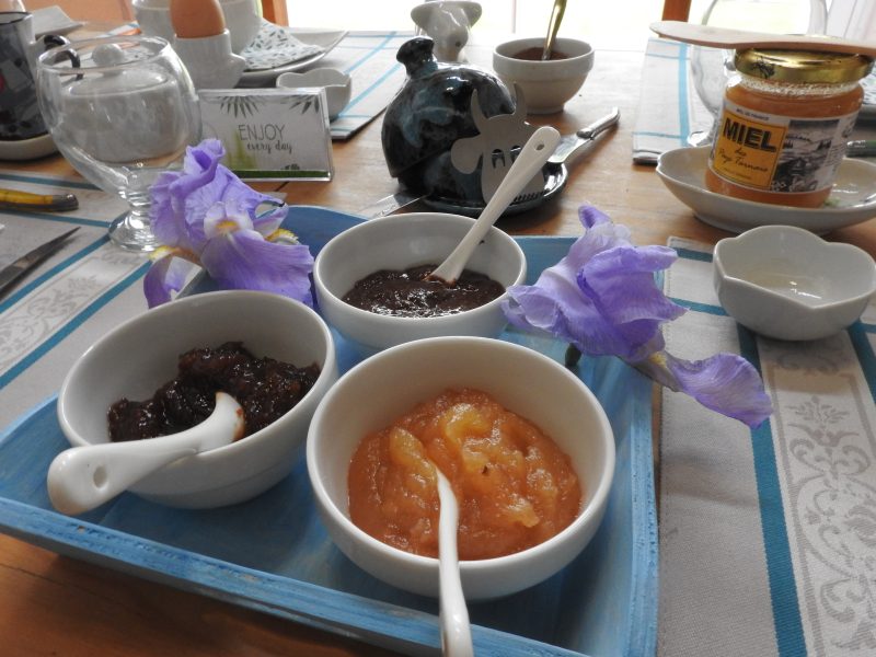 Moment savoureux de la journée, à la table du petit-déjeuner, vous trouverez des viennoiseries et du pain façonnés par un boulanger local (farines du sud-ouest), des confitures maison (fruits bio de notre verger), du lait, du beurre et des yaourts d'une ferme locale, de la pâte à tartiner chocolat / noisette artisanale du Lot, du miel d'apiculteurs du Tarn, du jus de pommes bio du verger de notre maraicher JANGOPOM à Gaillac, du muesli bio, du café, du chocolat chaud et différents thés & tisanes bio, des fruits de notre jardin , des pâtisseries faites maison et des œufs de nos poules nourries aux grains bio produits par un céréalier tarnais.