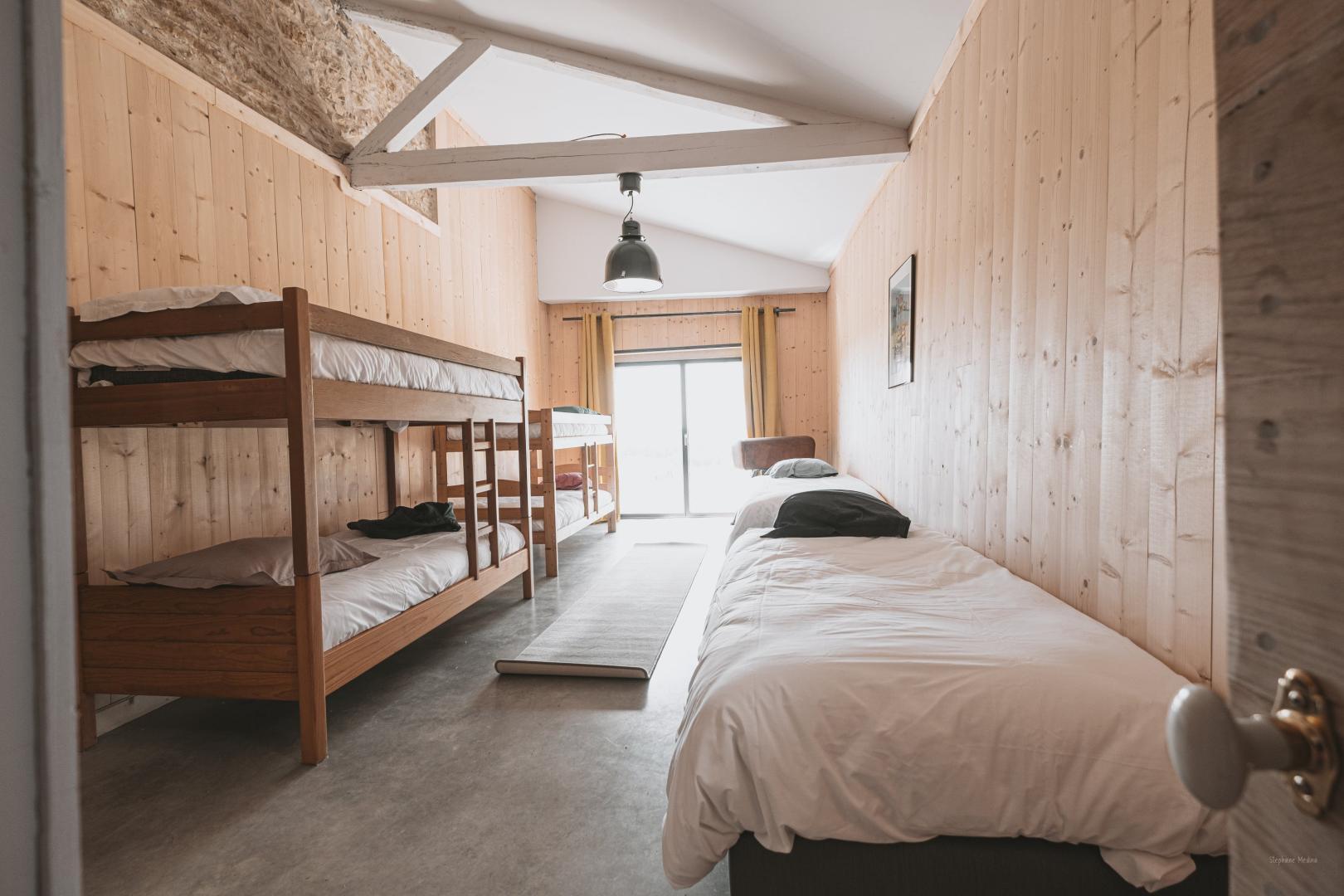 - une chambre familiale avec 2 lits superposés 90x200 + 1 lit 180x200 (modulable), salle d’eau et WC