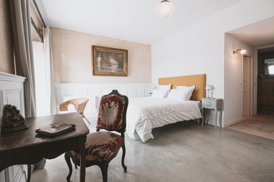À l’étage, trois belles chambres doubles, chacune avec lit 180x200 et sanitaires privatifs (deux avec salle d’eau et WC, une avec salle de bain et WC)