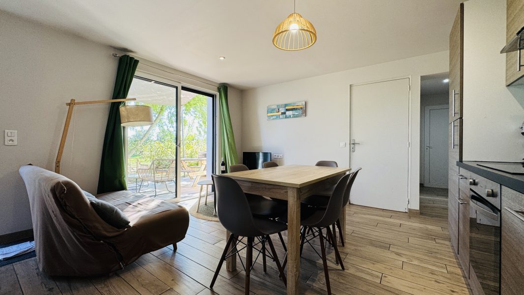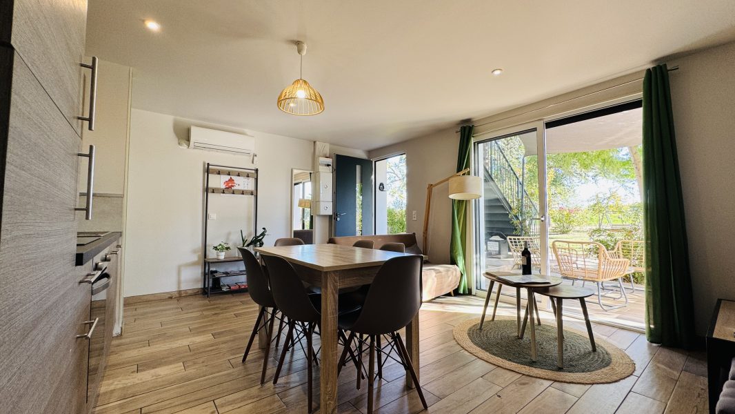 Grâce à sa baie vitrée, la luminosité du séjour-cuisine souligne l’appel au farniente avec un canapé où vous pouvez chaleureusement vous installer pour partager de merveilleux moments conviviaux autour d’une décoration apaisante et agréable. Des équipements tels que la télévision connectée, YouTube