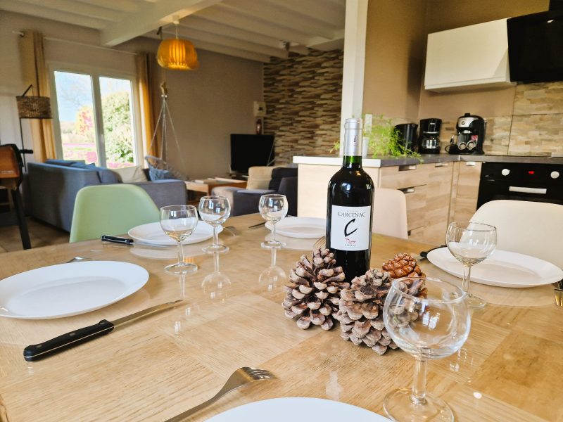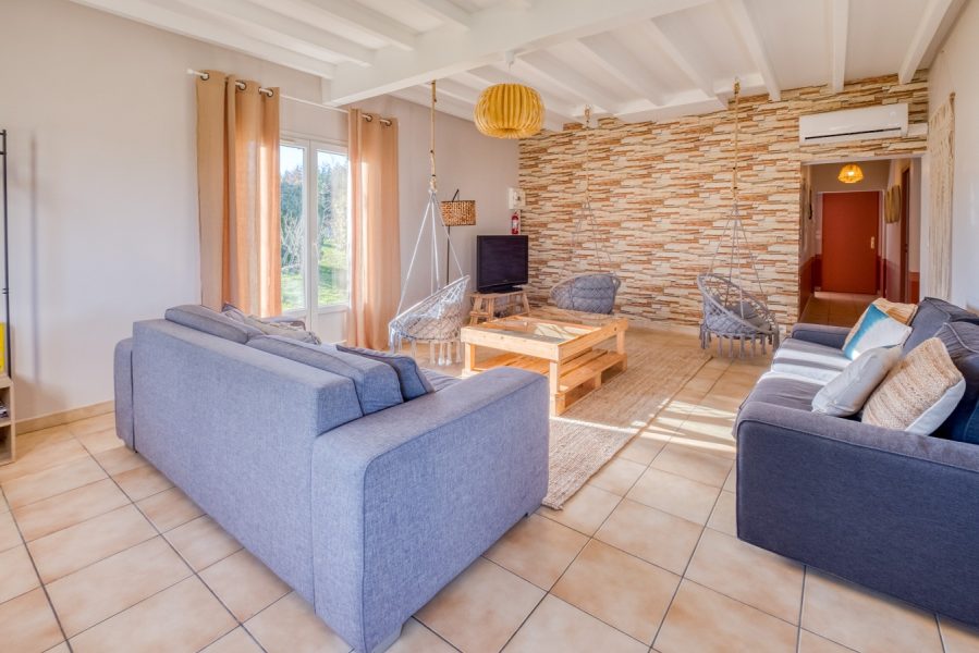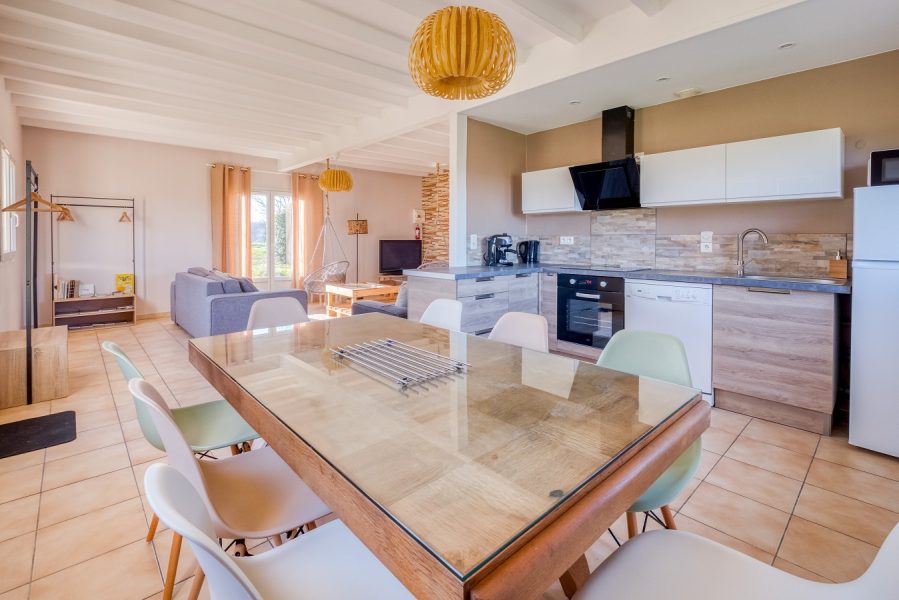 Un très grand salon-séjour avec 2 canapés et 3 fauteuils suspendus invite au bien-être et au lâcher prise dans une ambiance chaleureuse et attachante. La belle cuisine équipée offre une vue exceptionnelle sur la prairie et les bois, idéale pour se projeter dans de futures vacances en famille, entre amis, ou même pour des projets professionnels, voyages d’affaire, ou séminaires…