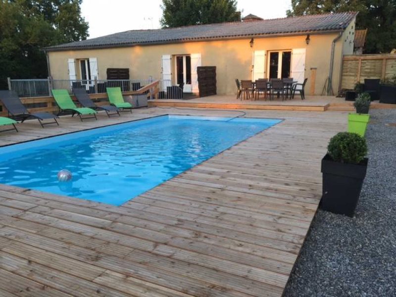 A l'extérieur : deux grandes terrasses, l'une est couverte à l'avant de la maison et donne sur le jardin. L'autre terrasse à l'arrière, côté cuisine, donne sur la piscine privative. Grand espace clos avec terrain de pétanque, salon de jardin, barbecue et plancha. Piscine 8x4, ouverte toute l'année, elle est chauffée de fin mai à fin septembre selon météo.